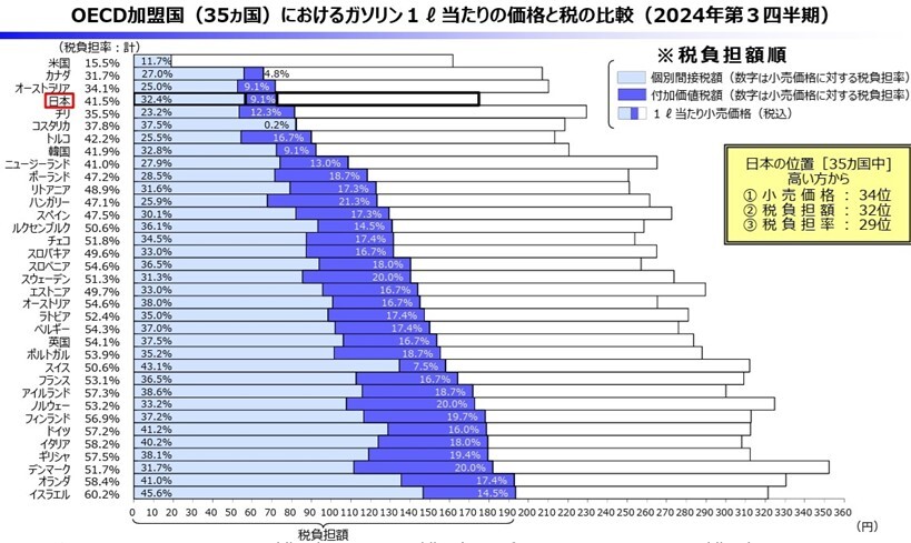 この間、与党は衆議院での再議決により暫定税率を復活させ、2008年5月1日から再び53.8円の税率が適用されることになった。この間、私たちは市民活動として「道路財源を考えるシンポジウム」を開催している。与野党の議員にも参加していただき、暫定税率の維持、道路特定財源は一般財源化を求め、その財源を幅広く、公共交通予算に使えるよう要望した。クルマの社会的費用、エネルギー環境問題も視野に入れたものであった。その当時も我が国ガソリン価格は国際比較しても米国に次ぎ安い水準であった。(下図は2024年の国際比較)その後、私たちも驚いたのであるが、福田首相は2009年4月、ガソリン税の道路特定財源制度を廃止し、一般財源化が実現している。